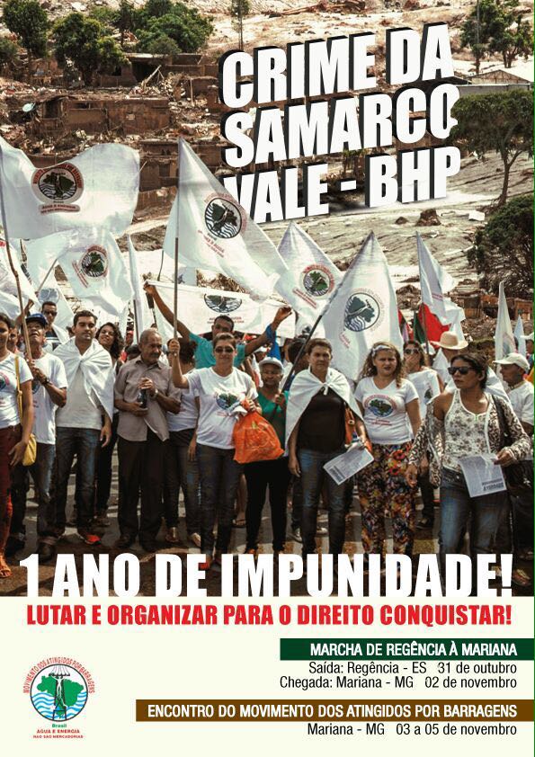 Para que o crime ambiental de Mariana nunca seja esquecido, o Movimento dos Atingidos por Barragens realizará, de 31 de outubro a 5 de novembro, a atividade “1 Ano de Impunidade! Lutar e Organizar para o Direito Conquistar!”. A mobilização começará com a Marcha de Regência a Mariana, com saída no dia 31 de outubro de Regência, no Espírito Santo, e chegada no dia 2 de novembro a Mariana. De 3 a 5 de novembro, será realizado o Encontro do Movimento dos Atingidos por Barragens, em Mariana.