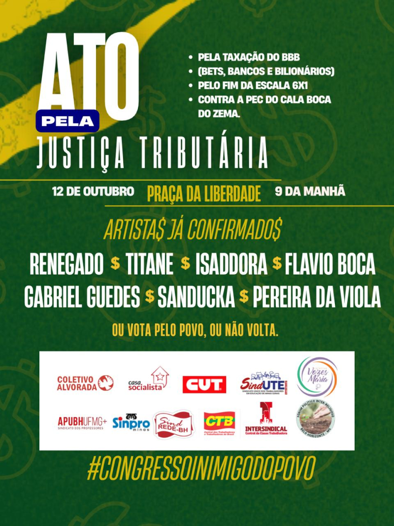 Vamos mostrar a nossa força, ocupar as ruas e exigir a taxação do BBB já, o fim da escala 6x1 e aqui em Minas, a Derrubada da PEC do CALA BOCA do Zema que quer calar o povo mineiro.